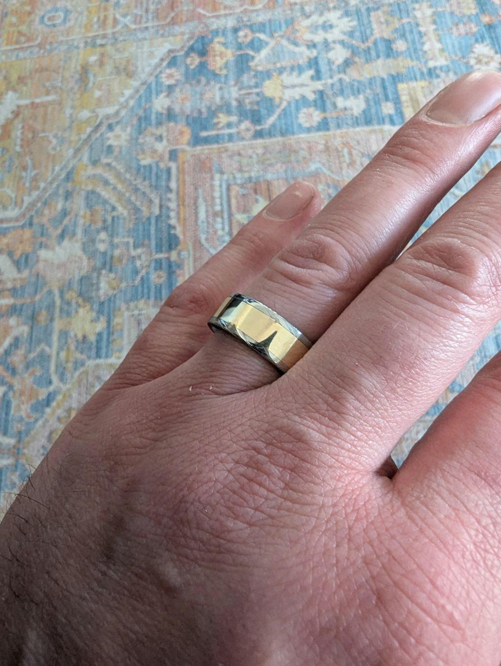 The ring couldn't be better. It feels great on my hand and looks amazing. Exceptional work, I am very happy with my purchase. The inlay looks great in the Damascus steel.